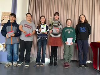 Am 4. Dezember fand der schulische Vorlesewettbewerb in der feierlich geschmückten Aula statt. Die besten Leserinnen und Leser der 6. Klassen lasen aus ihren Lieblingsbüchern vor. Gespannt hörten die Schüler*innen der 5. und 6. Klassen Texten aus „Woodwalkers“, „Ruby Redfort – Gefährlicher als Gold“ und den „13 ½ Leben des Käpt’n Blaubär“ zu. Besonders schwer war die zweite Runde, bei der die 6 Schüler*innen eine unbekannte Textstelle aus dem Jugendbuch „Grüne Gurken“ von Lena Hach vorlesen und in ganz neue Rollen schlüpfen mussten. Das Hineintauchen von Ruby in den neuen Text beeindruckte die Jury sehr und sie verlieh ihr die Urkunde als beste Vorleserin der Scharmützelsee-Grundschule. Wir schicken Ruby in die nächste Runde beim Bezirksentscheid und drücken ihr dafür die Daumen. Vielen Dank an alle Schülerinnen und Schüler, die den Mut hatten, die Schulaula mit ihren Texten zu füllen!