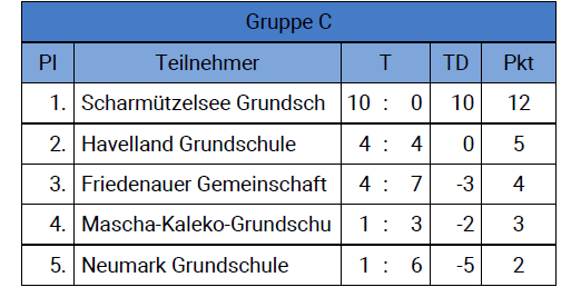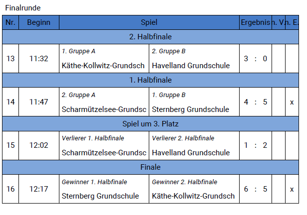 Als Tabellenzweiter ging es im Halbfinale dann gegen die Sternberg-Grundschule. Es entwickelte sich ein ausgeglichenes Spiel mit Chancen auf beiden Seiten. Leider waren wir auch hier wieder zu verschwenderisch mit unseren Möglichkeiten. Das nun folgende 9m-Schießen verloren wir dann gegen den späteren Sieger. Glückwunsch an die Sternberg-Grundschule!
