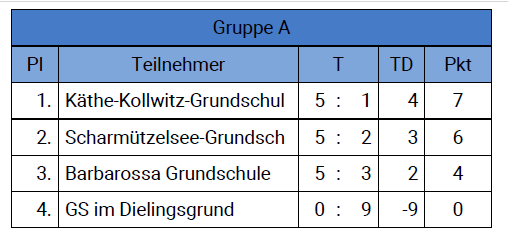 So konnten wir uns also souverän für die Hauptrunde qualifizieren, die dann im Februar stattfand. Auch hier starteten wir konzentriert und gewann unsere ersten beiden Spiele: 2:0 gegen die Barbarossa-GS und 3:0 gegen die Grundschule im Dielingsgrund. Im dritten Spiel mussten wir dann zum ersten Mal Gegentore hinnehmen und konnten unsere eigenen Chancen nicht gut nutzen, sodass wir gegen die sehr stark spielende Käthe-Kollwitz-GS 0:2 verloren.